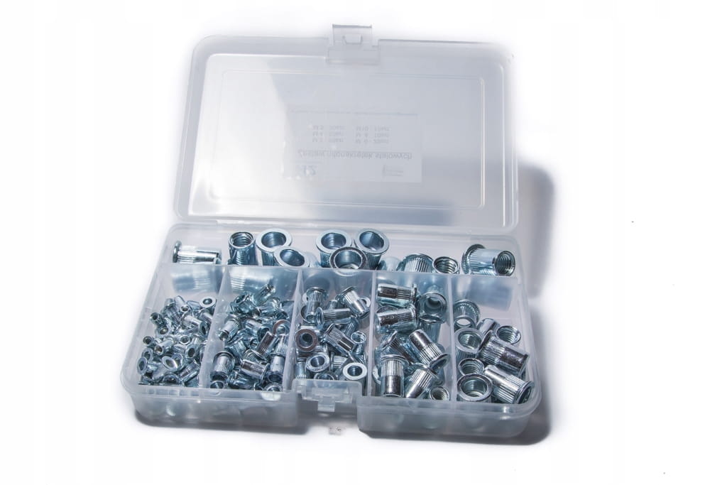 W zestawie 6 popularnych rozmiarów nitonakrętek stalowych